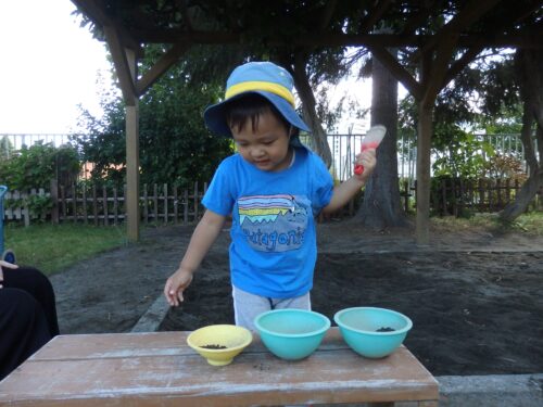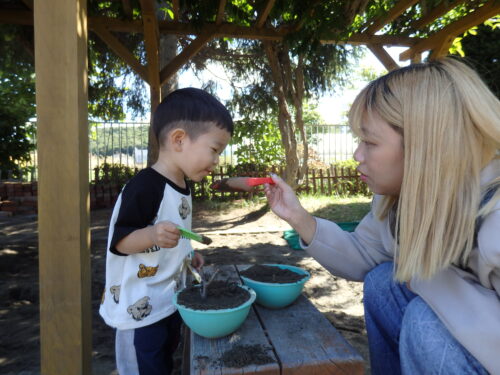 大好きなお砂場遊び♪沢山お料理を作って皆に振舞ってくれました。お友だち同士の交流も見られるようになりましたよ😊