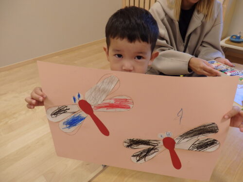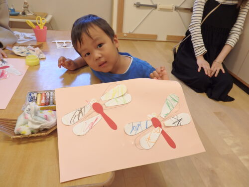 お部屋に戻り、クレヨンとのりで「トンボ」を作りました!1学期に比べて集中力が付き、真剣に取り組んでいました✨