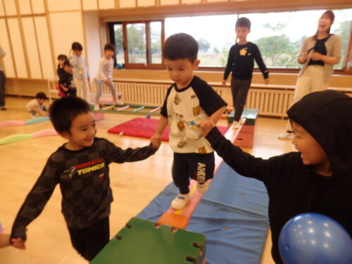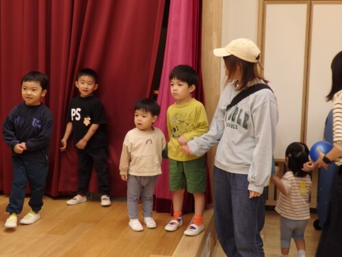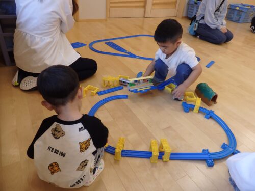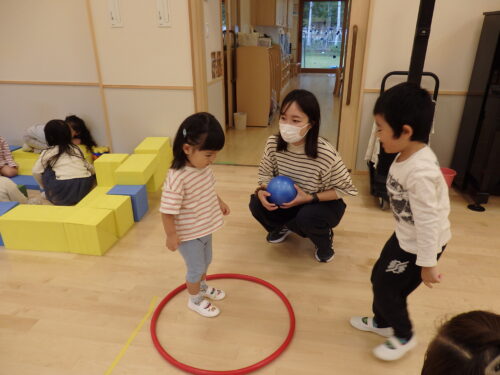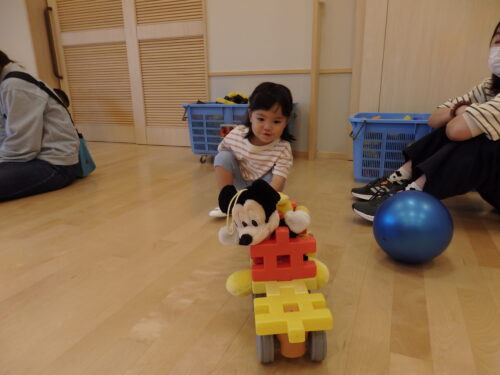 園に慣れてきたぴょんちゃん広場のお友だち。好きな遊びを見つけて楽しんだり、園のお兄さん・お姉さんに遊んでもらったりして楽しく過ごしました。