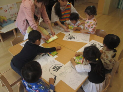 皆で当日着るはっぴの飾りを色塗りしました。春よりも力強く、全体をしっかりと