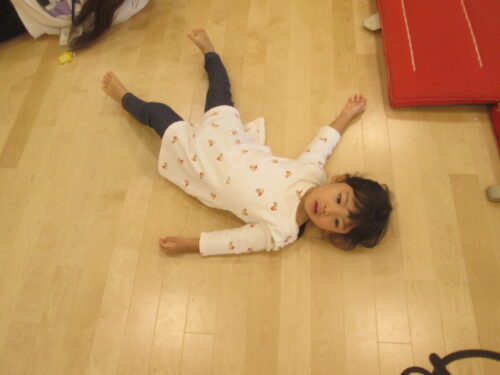 始めの頃は体を床に付けて寝転ぶ姿勢をためらう様子もありましたが、徐々に出来るように