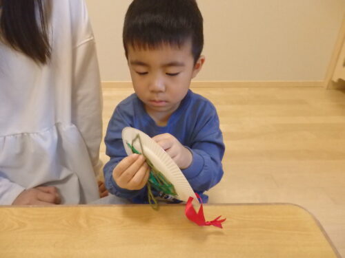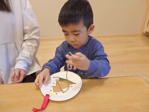 穴に紐を通し、ツリーの葉を付けていきます。「通したら裏返し」のお約束がよくわかり、何本も通していて集中していました。