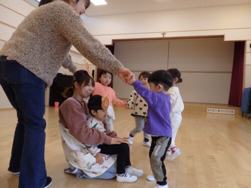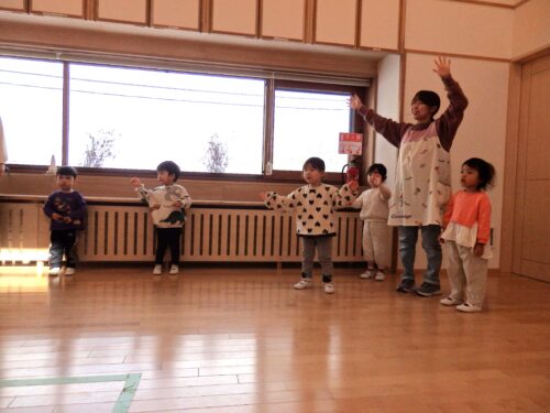 まずは、元気いっぱい体操をしました♪「おにはそとだよ ふくはうち」。段々と覚えて上手に踊る子が増えていきました。