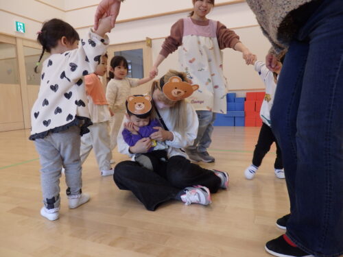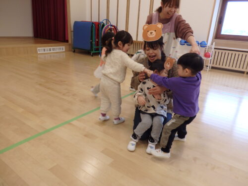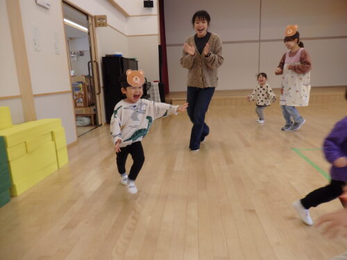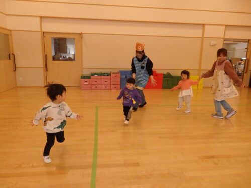 今日はみんなで「むっくりくまさん」をしました。ぴょんちゃんのお友だちも、おかあさんと一緒にクマをしたり、お友だちと追いかけっこが出来ました😊
