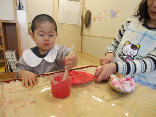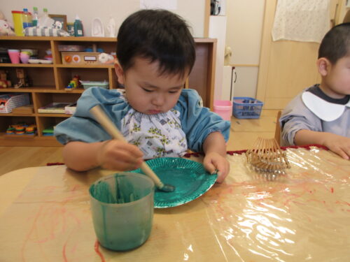 自分の好きな色の絵の具を選び、じっくりと筆で色を塗る事が出来ていました。