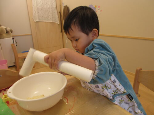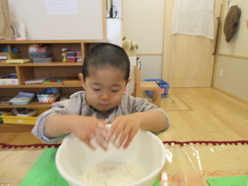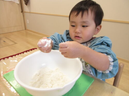 粉から粘土になる感触を楽しんだり、ぺったんぺったんとお餅をつく