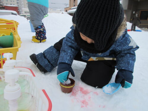雪に色水を混ぜて「アイス!」「かき氷!」など、イメージを膨らませたり。