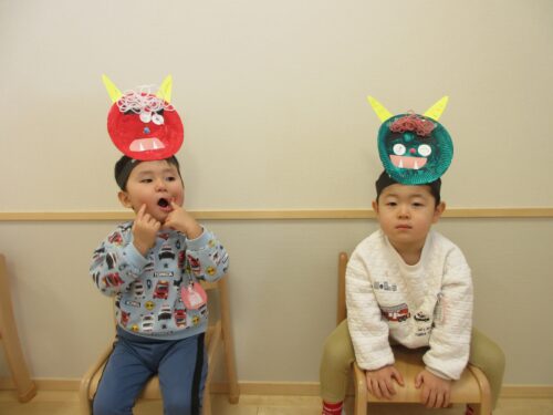 今日は節分だったので、つぼみさんも自作の鬼のお面を付けて豆まき!