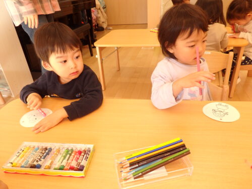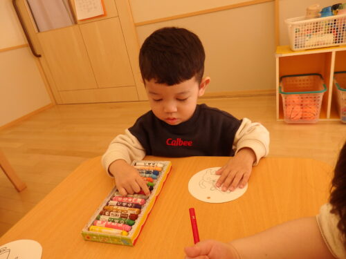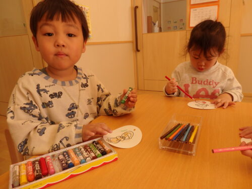 お話の中から好きな役を選びました。役のワッペン作りをしましたよ!クレヨンや色鉛筆を使って上手に色塗りをしました。