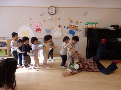 さぁ、劇ごっこ「おおきなかぶ」の始まりです!かぶ役の先生をみんなで抜きますよ!