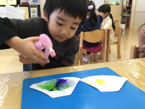 たんぽぽさんは、ペンで模様を描いてから、水をかけると色が広がる