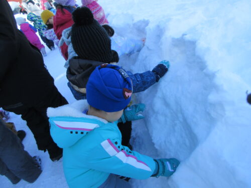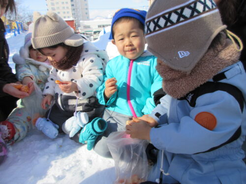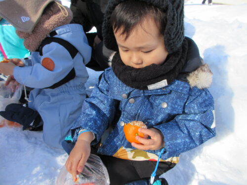 まずはみかん探し。みんなで雪の中からみかんを探します。
