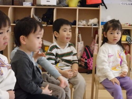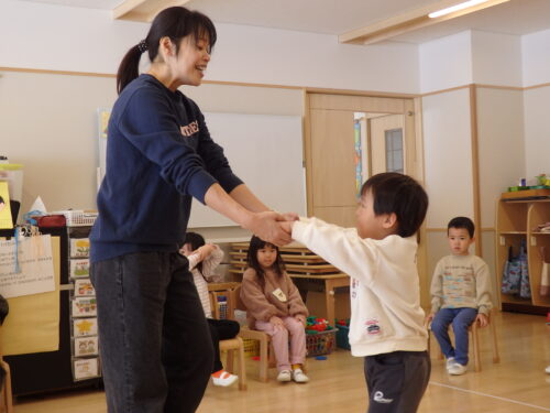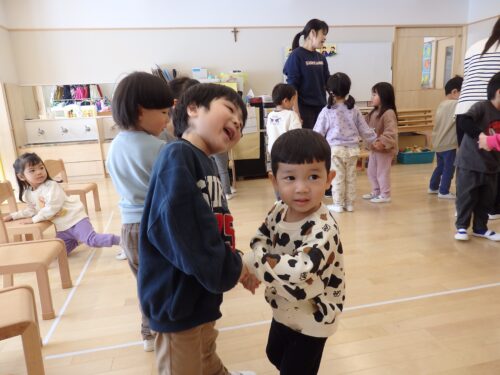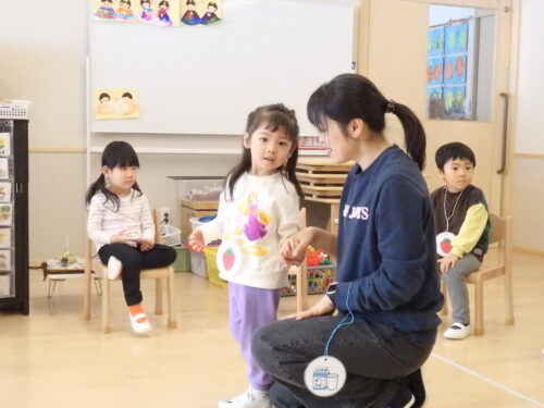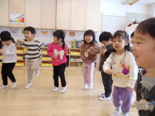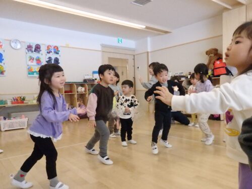 今日は年少さんのお兄さん・お姉さんのクラスに行き、ゲームやわらべ歌をして遊びました。ぴょんちゃんのお友だちは経験のある活動だったので、皆意欲的に参加していましたよ!