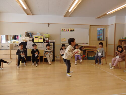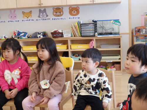 「おちゃをのみにきてください」のわらべうたをしました。ぴょんちゃんのお友だちが自ら見本に立候補してくれました✨