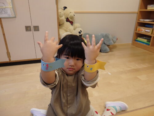 今日はお部屋でこいのぼり製作をしました。「こいのぼりブレスレット」です。シールを貼ってうろこにしました。