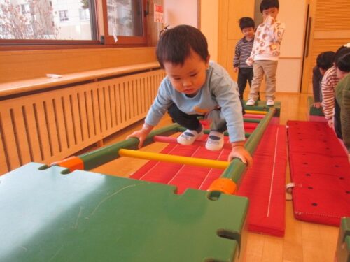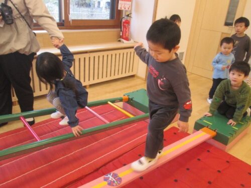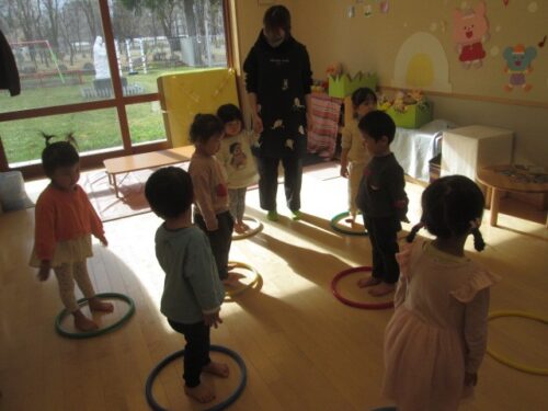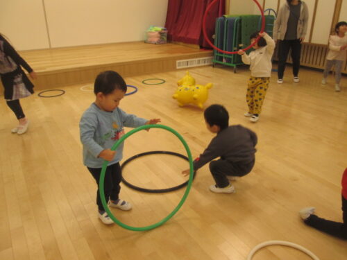 音楽が止まったらフープの中に入るというストップゲームを楽しみました。
