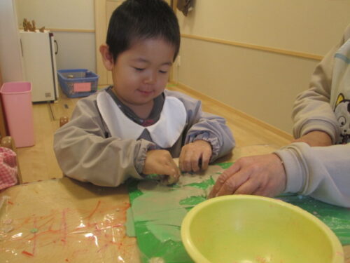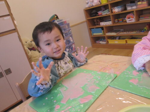 その後は片栗粉粘土。ドロッとしたり固まったりする不思議な感触に、